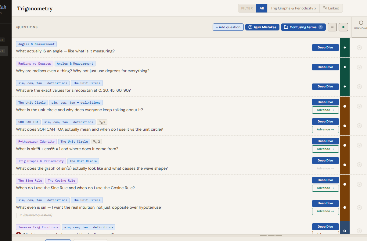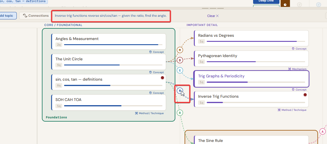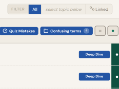 Deep Dive locks you into one question so you can complete the higher-order work that creates real mastery. Prerequisites are visible so you stop building on missing foundations.