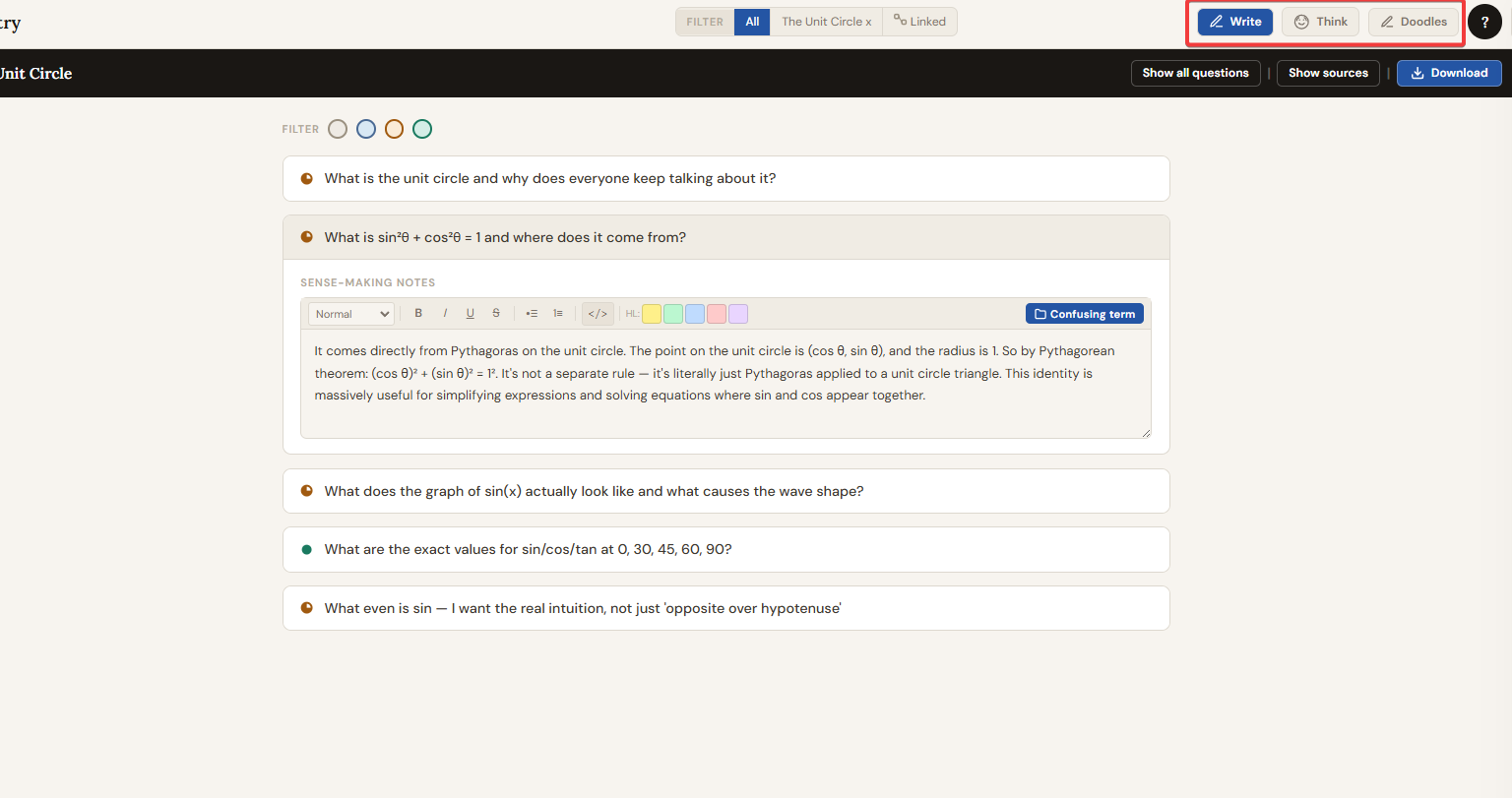 Select a topic and enter Focus Mode to work only on the questions that belong to it. Use Write Mode to build and refine your understanding in a clean, full-screen workspace. Switch to Think Mode to interrogate those same questions through structured depth prompts, one at a time.