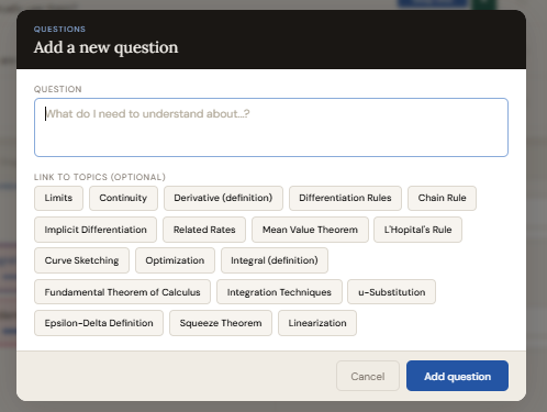 Click "+ Add question" in the Questions header. Write the question, then click topic names to link it to them. Every question starts at Unknown.