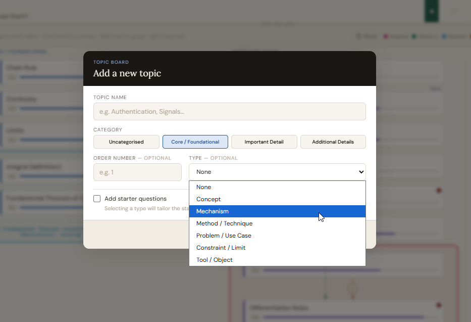 The Topic Board is where you build the structure of your knowledge. A topic is anything you need to learn: a concept, a technique, a tool, a term. Topics do not need to be understood yet. They just need to exist so nothing gets lost.