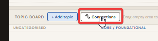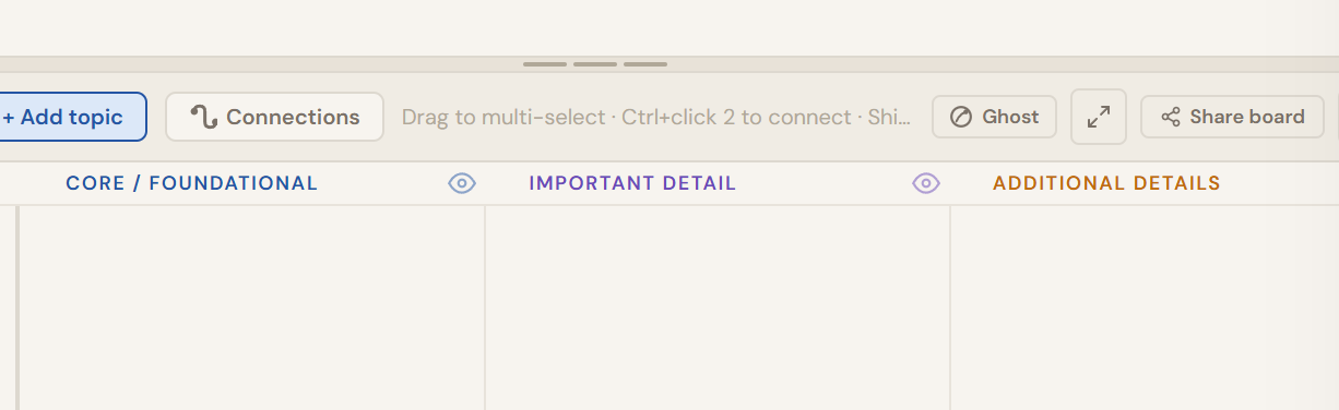 Click "+ Add topic" in the Topic Board header. Do not organise yet. Get everything out of your head first. Once they are all visible, drag cards into Core, Important Detail, or Additional Details. Then Ctrl+click two cards to draw a connection between them and describe the relationship.