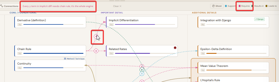After reading, you drag Limits, Functions, Rate of Change, and Derivatives into Core / Foundational. You Ctrl+click Derivatives and Limits, choose "Requires", and type "A derivative is defined as a limit, so limits must be understood first." You Ctrl+click Derivatives and Rate of Change, choose "Results in", and type "Computing a derivative gives you the instantaneous rate of change at any point." You drag Chain Rule and Product Rule into Important Detail and draw "Supports" connections to Derivatives. You drag Optimization into Important Detail and draw "Leads to" from Derivatives.