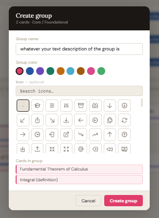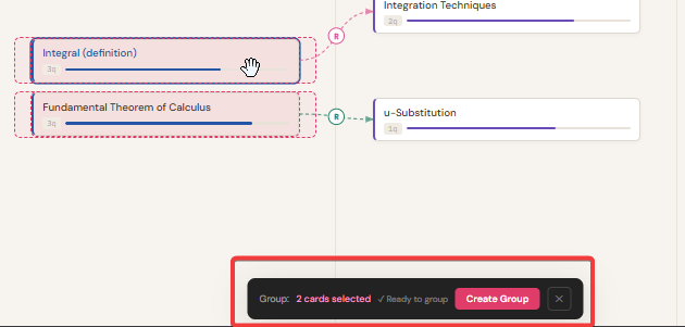 Click "Create group". The selected cards get a shared coloured border and a named label at the bottom of the group box. To delete a group, right-click the group label area and select the delete option.