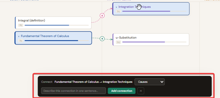 Ctrl+click the first card, then Ctrl+click the second. A bar appears at the top of the Topic Board showing both card names. In that bar, open the dropdown and select a relationship type such as Requires, Leads to, Extends, or Causes. Then type a one-sentence description of the specific relationship in the text field. Click "Add connection". A curved arrow appears between the two cards, colour-coded by its relationship type, with the first letter of the label on the curve. Hover over any arrow to read the full sentence in the header bar.