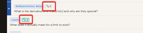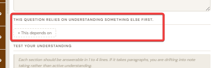 Click it to open a search field. Type part of any other question's text and select it from the list that appears. Once linked, both questions show a small chain badge: position 1 means it should be learned first, 2 means it depends on something, and higher numbers extend the chain. Use this to make learning order explicit when your questions have a genuine prerequisite structure.