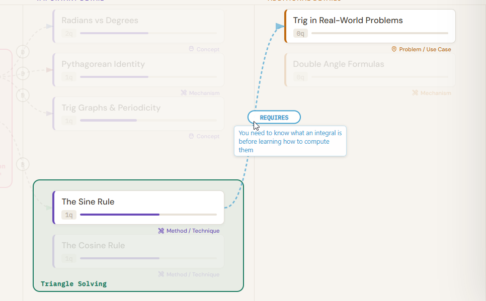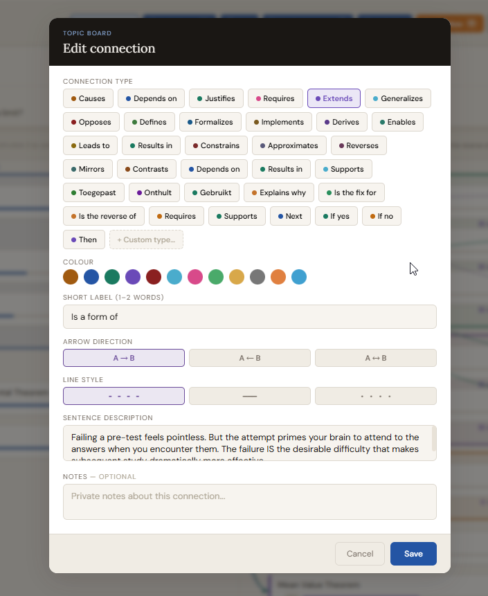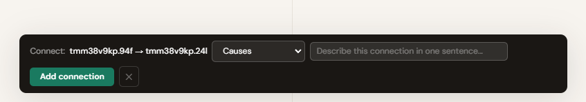 Open the dropdown and select a relationship type such as Requires, Leads to, Extends, or Causes. Then type a one-sentence description of the specific relationship in the text field. Click "Add connection". A curved arrow appears between the two cards, colour-coded by its relationship type, with the first letter of the label on the curve. Hover over any arrow to read the full sentence in the header bar.