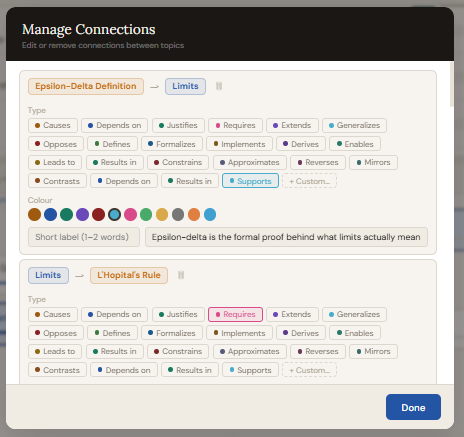 A small modal opens where you define the label and colour. That type is then available for all future connections in this subject.