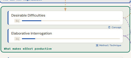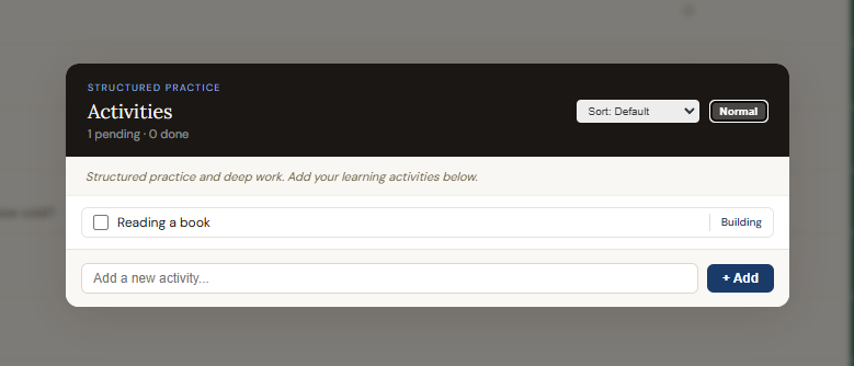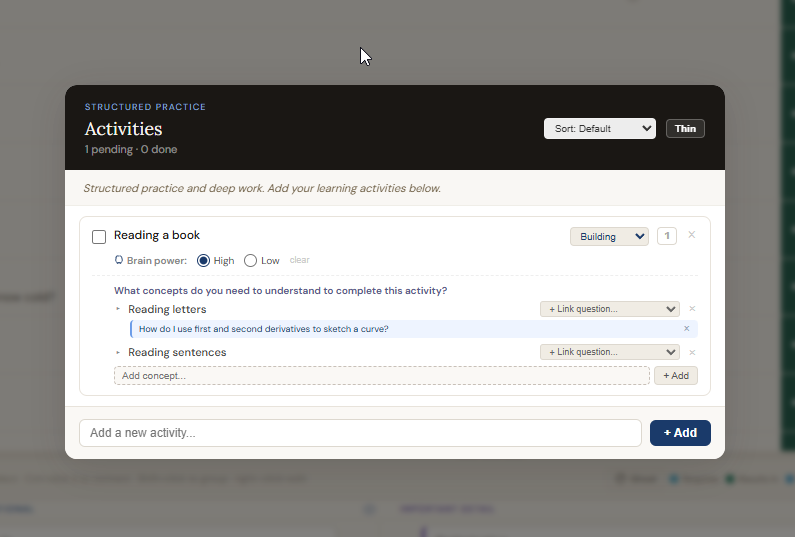 Activities is a structured to-do system for your learning sessions. It lives between the Confusing terms and Mistakes buttons in the Questions header. Use it to plan and track what you are actually doing: reading, building, reviewing, testing. Unlike a generic task list, each activity can record the kind of mental effort it requires and map it to the specific concepts you are trying to understand.
