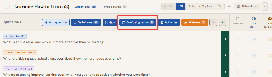 How to add a term: Open any question's ThinkNotes panel. In the rich-text editor, select any word or phrase that confuses you. In the formatting toolbar, click the "Confusing" button. The selected text is saved immediately and a toast notification confirms it. If you flag the same term three or more times, the toast offers a direct shortcut to create a question for it.