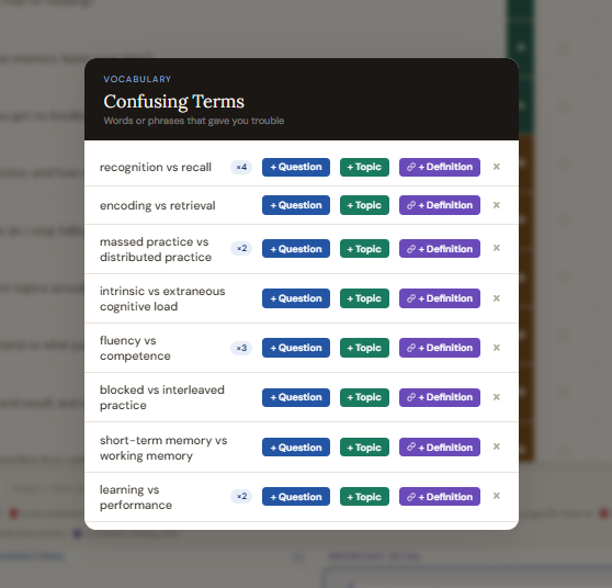 Viewing and acting on terms: Click the "Confusing terms" button in the Questions header (it shows a count badge when terms exist). The drawer opens listing every saved term. Terms flagged more than once show a count badge. Each term has three action buttons: "+ Question" opens the add question modal, "+ Topic" opens the add topic modal, and the X button deletes the term.