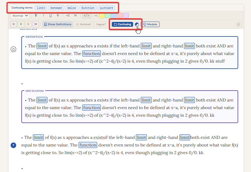 Highlighting inside the editor: Click the sphere icon (a half-blue diagonal circle) next to the "Confusing" button in the toolbar to toggle confusing term highlighting. When active, every saved confusing term in the current subject is highlighted inside the editor as you write, reminding you to spot those words as they show up in your ThinkNotes.