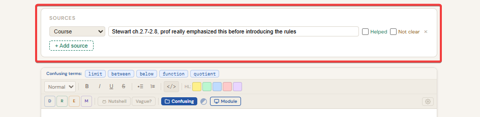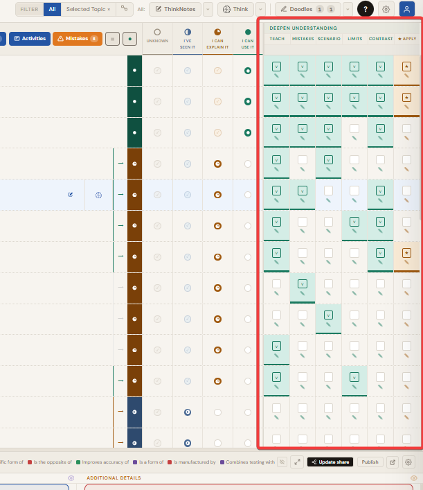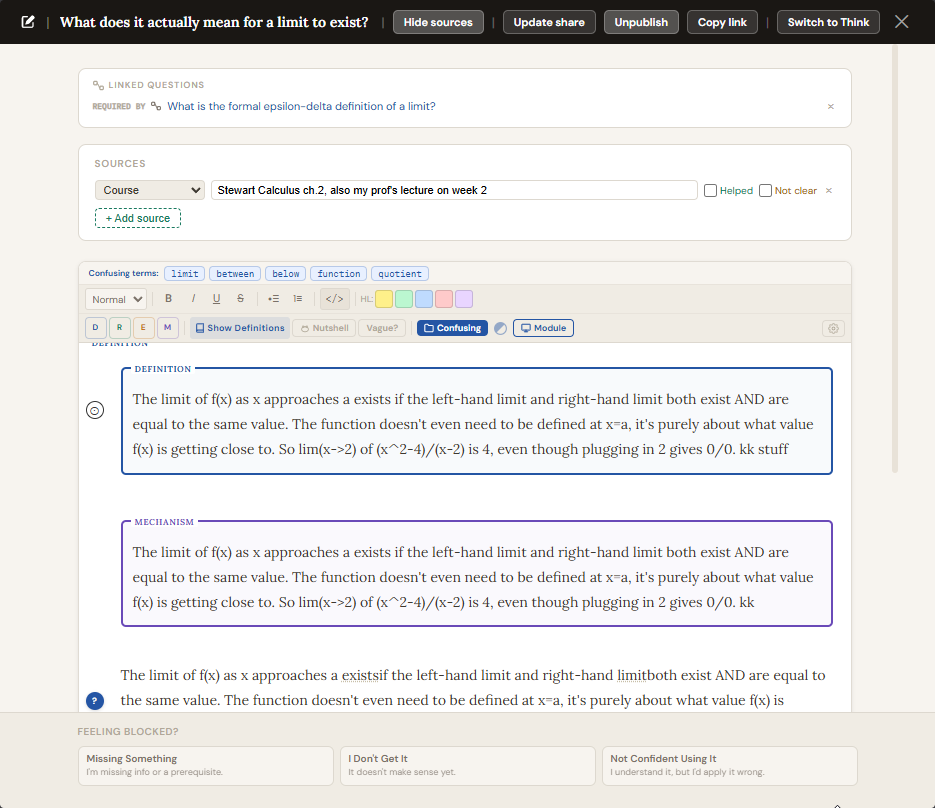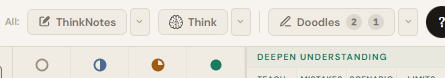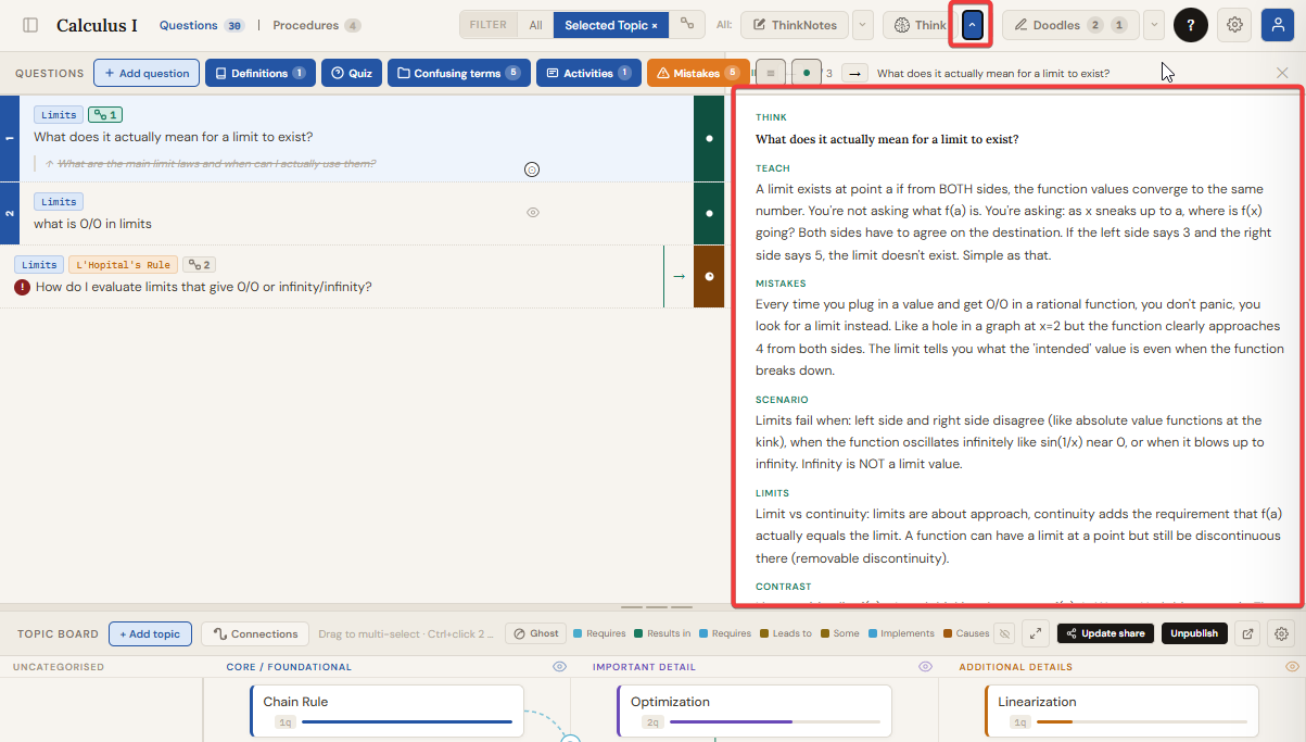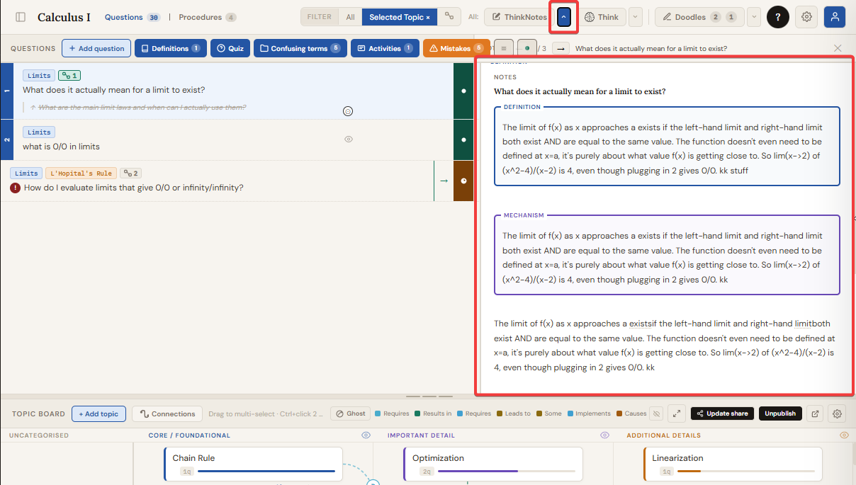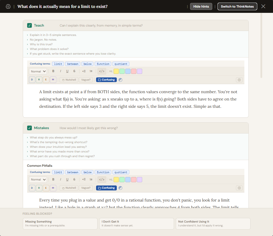 ThinkNotes is the app's own text editor, built specifically for learning. It is not a generic notes app. It is designed to help you think through what you know, catch weak spots in your understanding, and connect your writing to the rest of your study system. It shows up in the per-row full-screen ThinkNotes panel and in the top-bar ThinkNotes accordion mode.