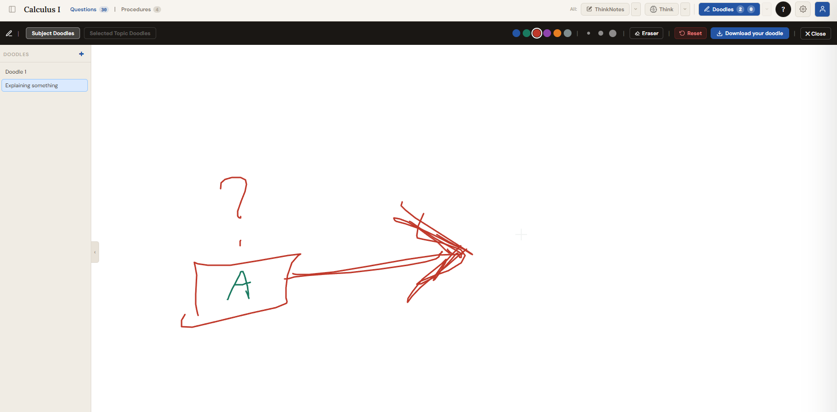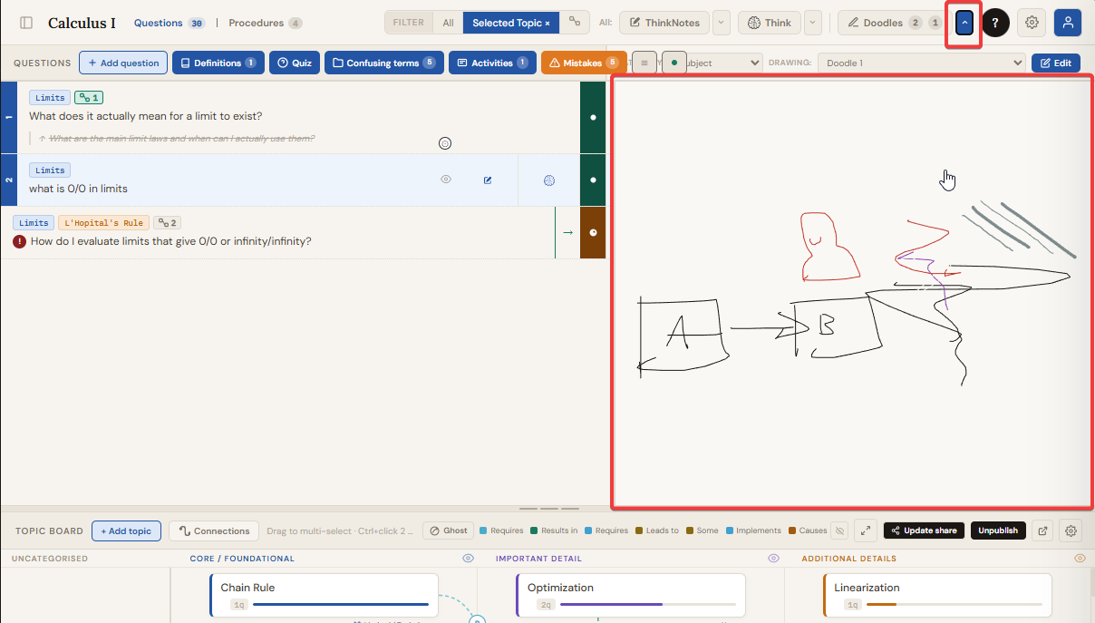 The Doodle button in the Questions header opens the doodle sketch panel. You can draw freehand diagrams, sketches, or visual notes linked to the currently selected question. Multiple sketches can be saved per question, organised by category and drawing name. The Doodle button and its ▼ arrow are hidden when ThinkNotes or Think focus mode is active.