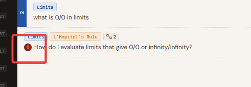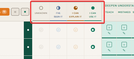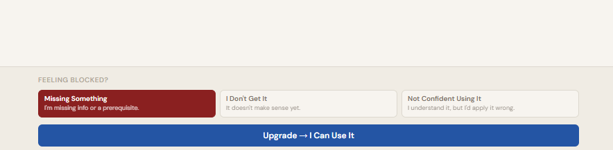 The "Feeling Blocked?" section is at the bottom of that panel. Three options appear: Missing Something (you lack a prerequisite or resource), I Don't Get It (it makes no sense yet), or Not Confident Using It (you understand it but would probably apply it wrong). Click the one that matches. A red dot appears on the question row and on the parent topic card. Click the active option again to clear it.