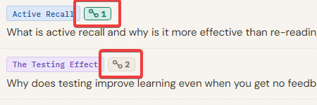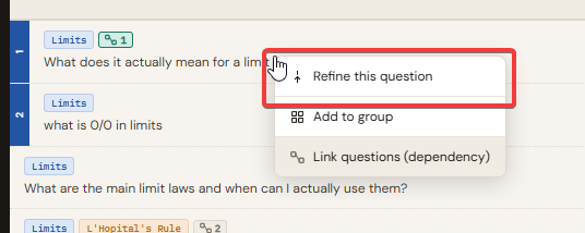 If one question cannot be understood until another is clear, you can link them into a dependency chain. Drag one question and drop it on another. A menu appears with the option "Link questions (dependency)". Click it to create the link. Both questions then show a small chain badge on their rows: a green chain icon marks the root question (learn this first), and numbered badges show the order in the chain.