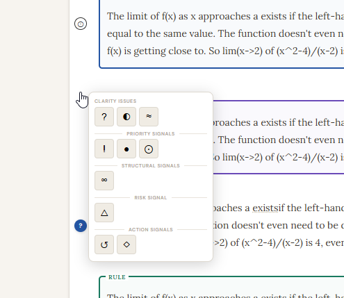 Teach: You write "A derivative measures how fast something is changing at one specific moment." in the Teach editor. You tick the checkbox.
