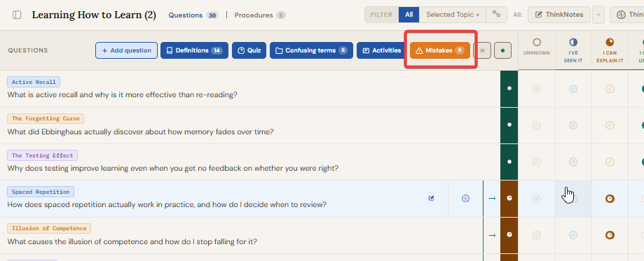 Click any stage dot on a question row to set its stage. Hover any question row and click the THINKNOTES button to open a full-screen ThinkNotes editor for that question, or click the THINK button to open the full-screen depth check panel. When something blocks you, use the "Feeling Blocked?" section at the bottom of the Think panel to mark the question as stuck. Add activities, mistakes, and quiz questions as you go.