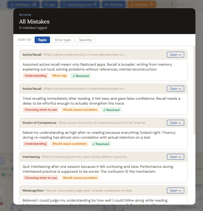 Sort controls at the top let you view all mistakes grouped by topic, by mistake type (Understanding / Choosing when to use / Doing the steps / Attention), or by severity (Minor slip / Would cause a problem). Each mistake entry shows its text, its type and severity badges, and an "Open →" button that opens the full-screen Think panel for that question so you can work on it immediately.