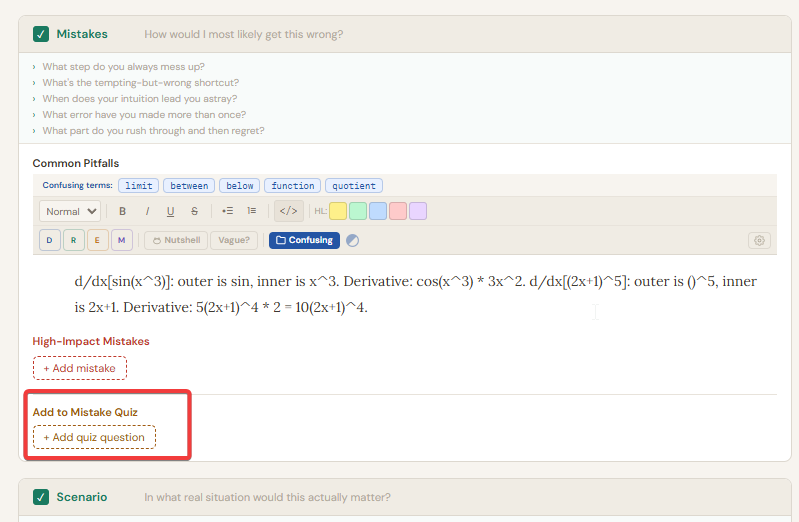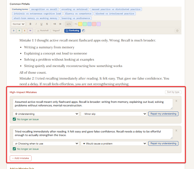 The Mistakes card shows a "Common Pitfalls" editor at the top and a High-Impact Mistakes list below it. Add mistakes with "+ Add mistake". Each mistake has a text field, a type dropdown (◎ Understanding / ⇄ Choosing when to use / ▶ Doing the steps / △ Attention), a severity dropdown (· Minor slip / ◆ Would cause a problem), a "Repair my understanding" button, and a "No longer an issue" checkbox. Use the sort toggle to view mistakes grouped by type. At the bottom of the Mistakes card, an "Add to Quiz" section lets you add quiz questions linked to that mistake.