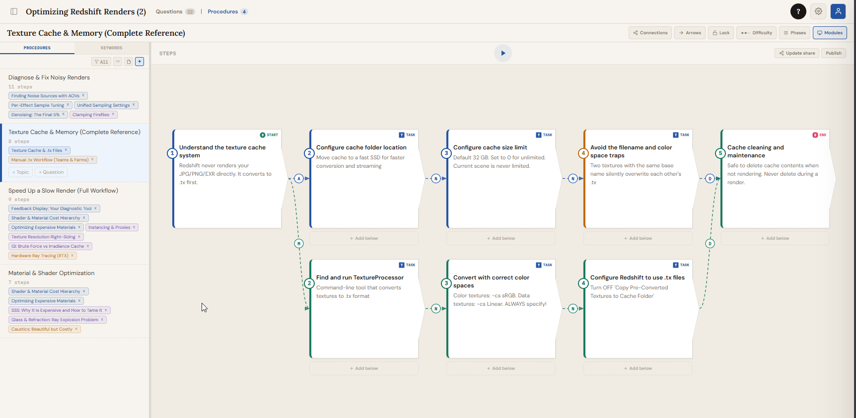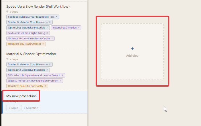 Procedures let you build step-by-step visual flowcharts for any process you are learning. Switch to the Procedures tab using the tab bar at the top of the Questions section. Each procedure is a separate flowchart with its own steps, connections, and layout.