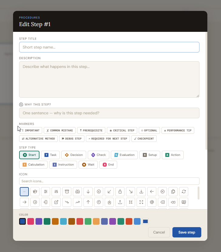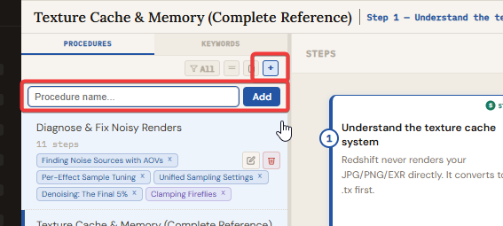 Click the "Import list" button in the Procedures sidebar to paste a numbered list. Each numbered line becomes a step. In complex mode, the first line of each item becomes the step title and remaining lines become a text module on that step.