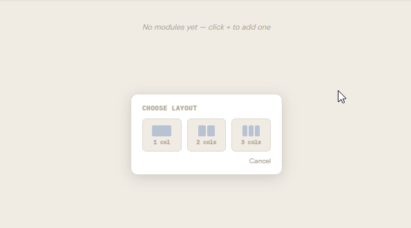 Click the gear icon on any module slot to open its settings panel (centred on screen). Click the x button on a module row to delete it.