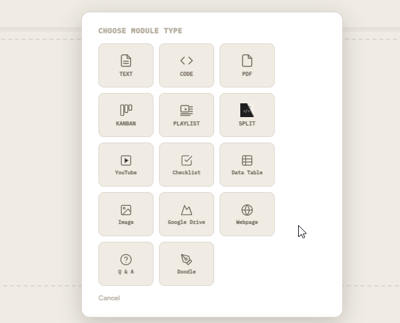 Each step can have one or more module rows attached to it. Modules are content blocks that hold study material, notes, or media directly on the step card. Click a selected step's "+ Add module" button to add a new row.