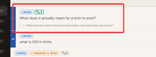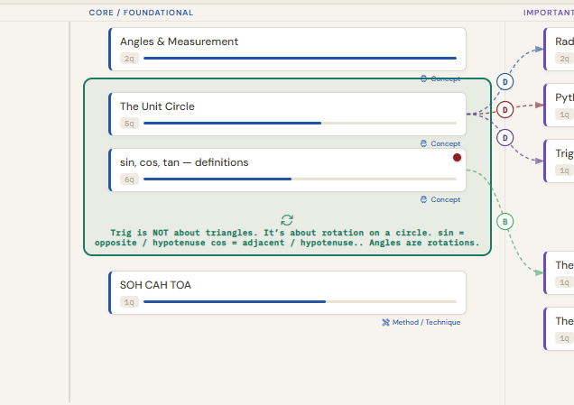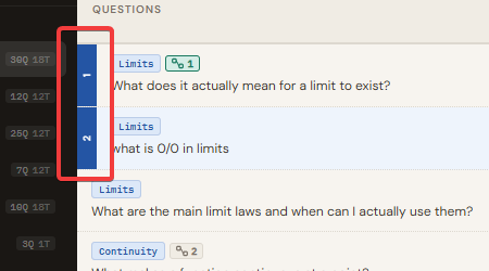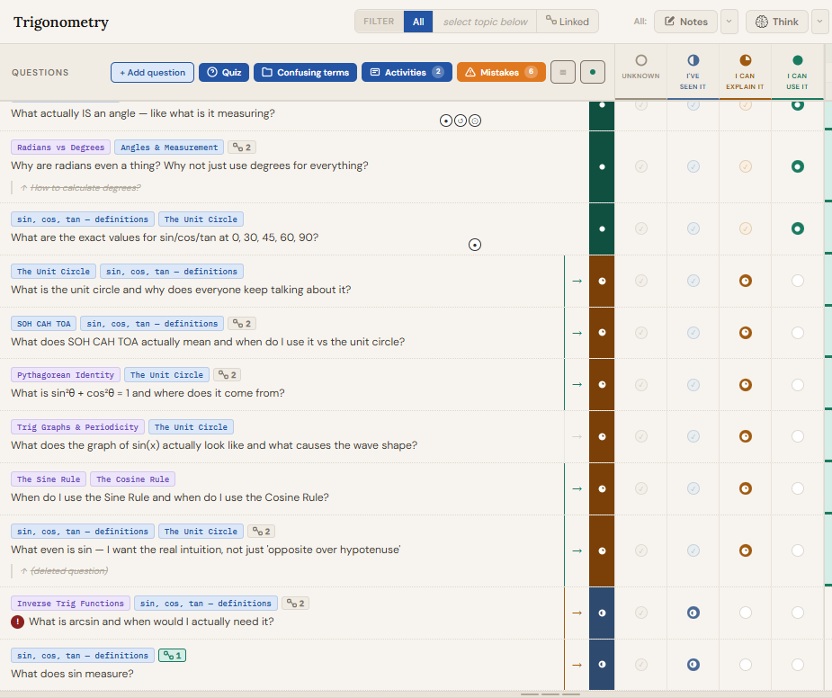 Every question you have about your subject lives here. Each question tracks one thing: how well you actually understand the answer right now. The stage is yours to set, and you move it forward only when your understanding genuinely shifts.