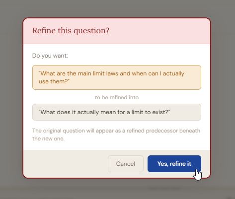 As you study, a vague early question often becomes obsolete once a sharper one replaces it. To absorb the old question into the new one, drag the older question by its row and drop it directly on top of the newer, sharper question. A confirmation modal appears showing both questions. Confirm the merge. The old question disappears from the main list. Its text is preserved inside the new question as a strikethrough line with a small arrow indicator showing it is a predecessor. To restore it as an independent question, right-click the strikethrough line and select the restore option.