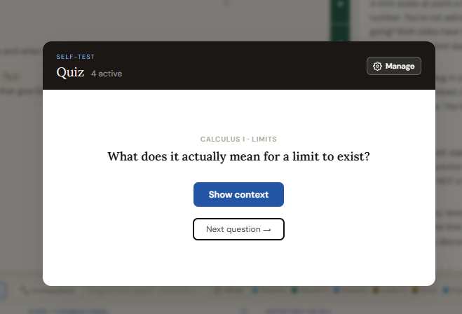 Running the quiz: Click the "Quiz" button. One question appears. Try to answer it mentally. Click "Show context" to reveal the original question it came from. After revealing context, five small confidence spheres appear labelled "How well did I know this?". Click a sphere from 1 to 5 to record your confidence. Clicking the same level again resets it to zero. Click "Next question" to move on.