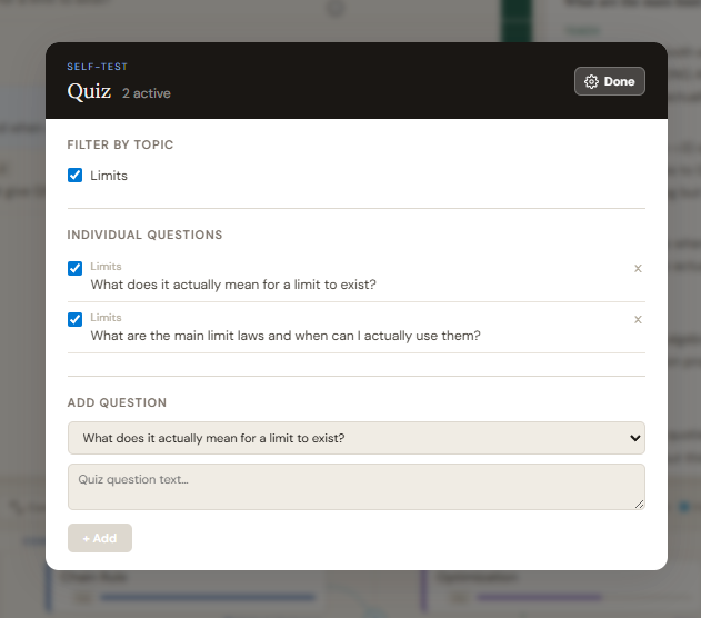 Managing the quiz: Click "Manage" in the Quiz panel header. A topic filter list with checkboxes lets you remove entire topics from the rotation. An individual question list lets you disable specific quiz questions without deleting them. Click "Done" to return to quiz mode.