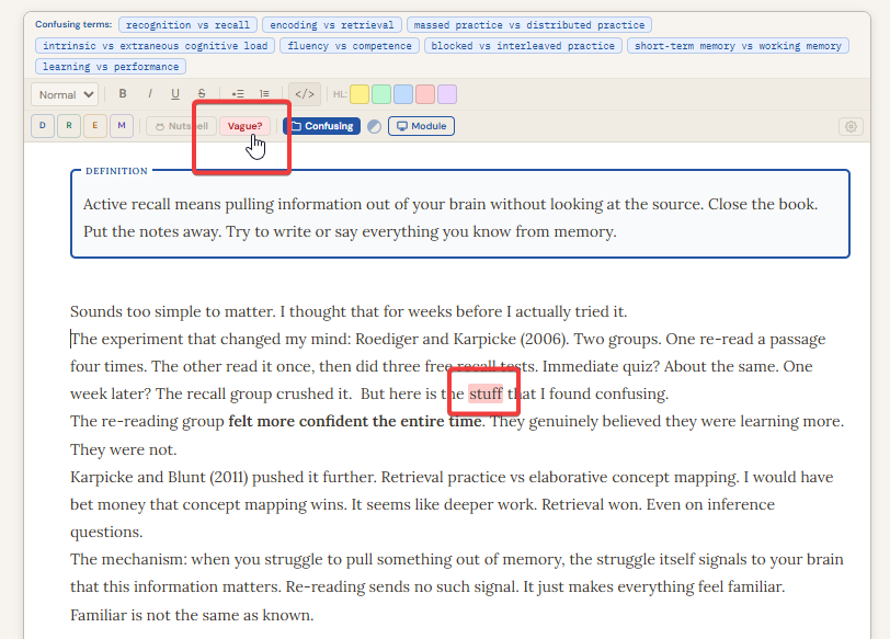 Confusing Terms captures words and phrases that keep interrupting your understanding as you write. It is not a glossary you build manually.