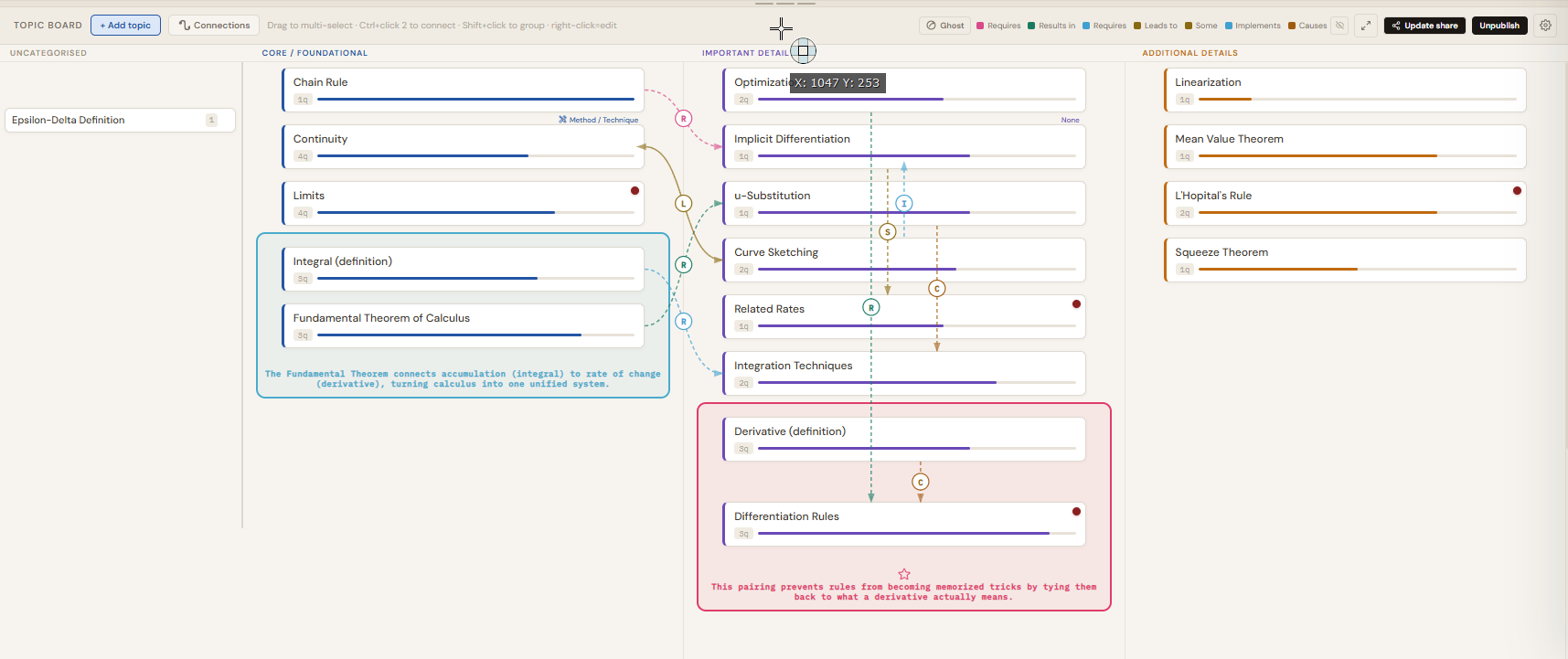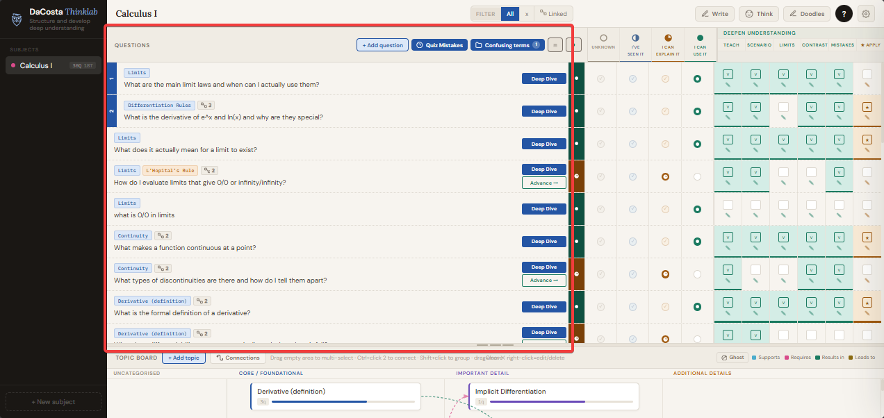 Drag any topic card left or right to move it between columns. The columns are not labels you assign once. They should reflect your current understanding of the subject and you should update them as that understanding deepens.