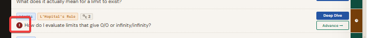 At the bottom of the Deep Dive panel is an Advance button. It is greyed out and locked until at least two depth checks are complete. The gate only applies to the final step from "I Can Explain It" to "I Can Use It". If you click the stage dot on the question row directly, the same gate applies and a tooltip explains that you need to open Deep Dive and complete two checks first.